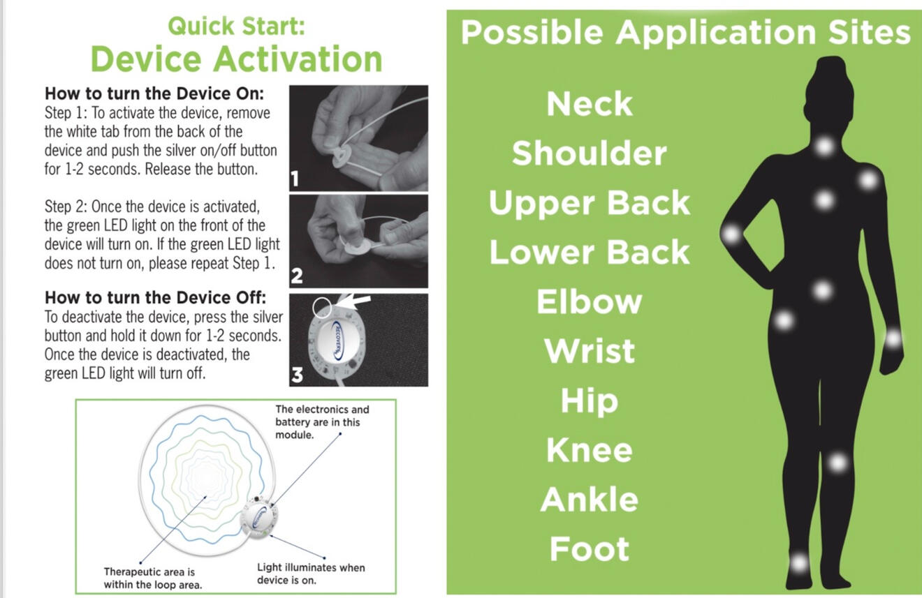 MECHANISM OF ACTIONThe device emits a safe, pulsed electromagnetic field (PEMF) that penetrates deeply into body tissues, but cannot be felt by the user. This PEMF therapy can significantly alter cellular activity in the affected area by:- Increasing afferent sensory nerve activity (high threshold A-alpha and A-beta nerves). The CNS perceives this stimulus as increased afferent noise which results in habituation, raising pain threshold levels and thus reducing perceived pain faster than the standard of care + placebo.- Activating the natural inflammatory reflex which is known to inhibit inflammation leading to less pain and edema resulting in optimal healing and recovery.