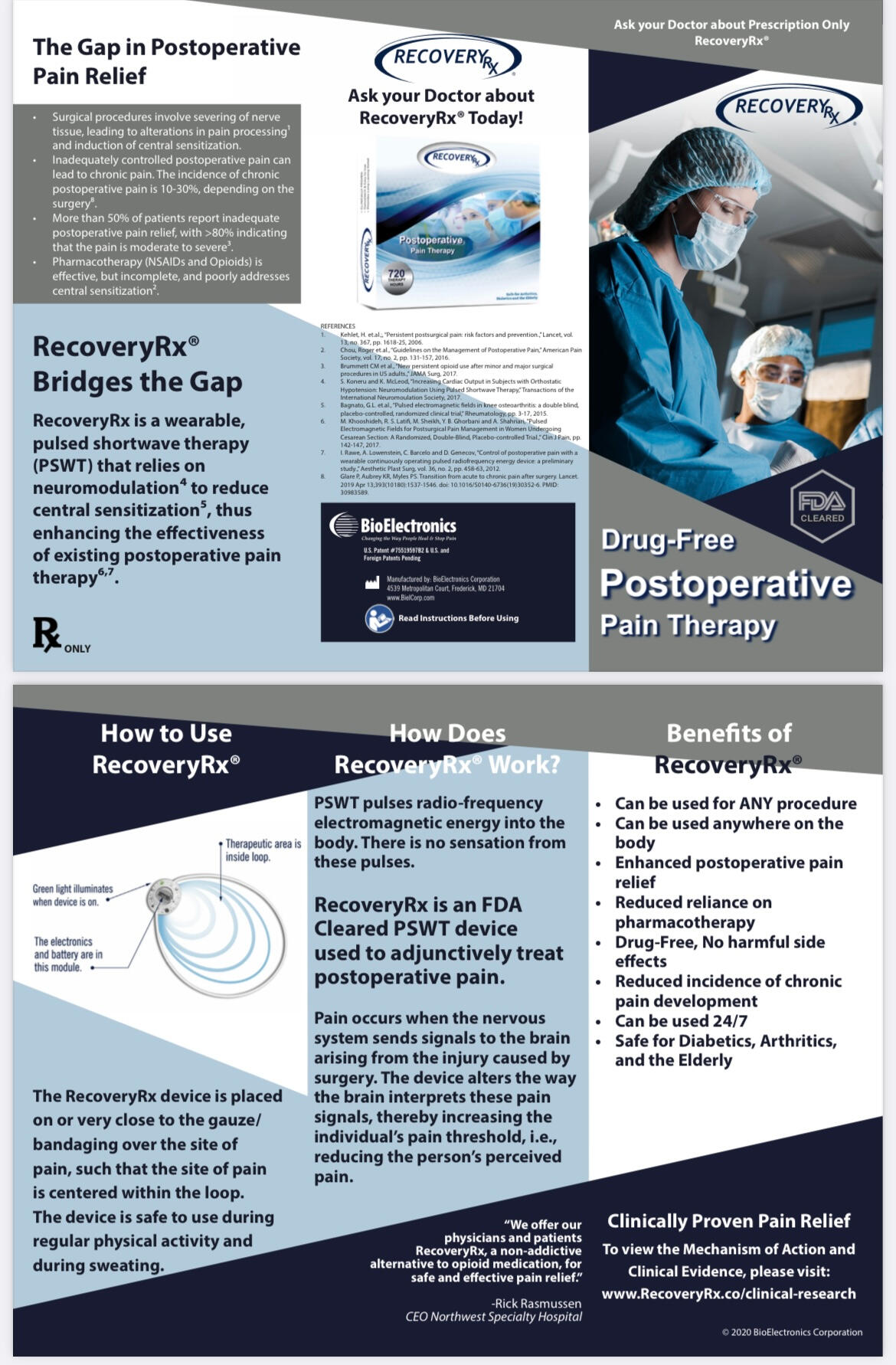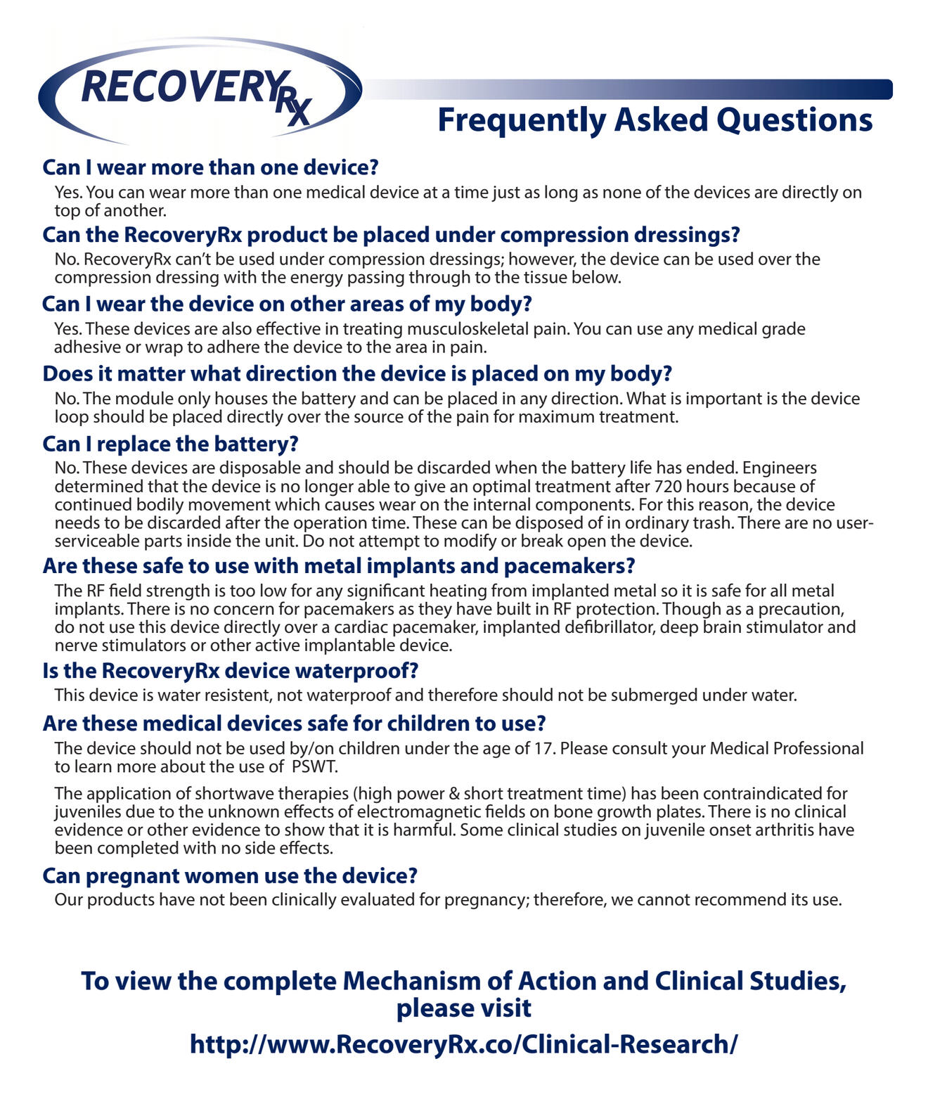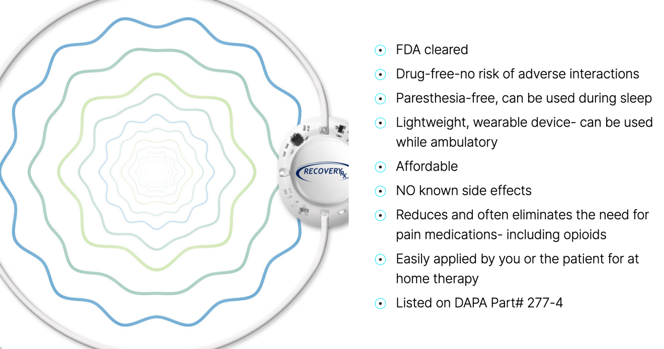 Working as an adjunct therapy, RecoveryRx® adds another dimension to multimodal approaches to pain management improving patient comfort. RecoveryRx® has been clinically shown to significantly reduce pain and postoperative pain and the use of narcotic pain medication postoperatively, potentially reducing the incidence of adverse side effects associated with these drugs.RecoveryRx is widely used to treat pain in a wide array of medical applications, including musculoskeletal pain, arthritis, edema, postoperative pain and the promotion of wound healing. These claims are backed by an extensive list of clinical publications and research.